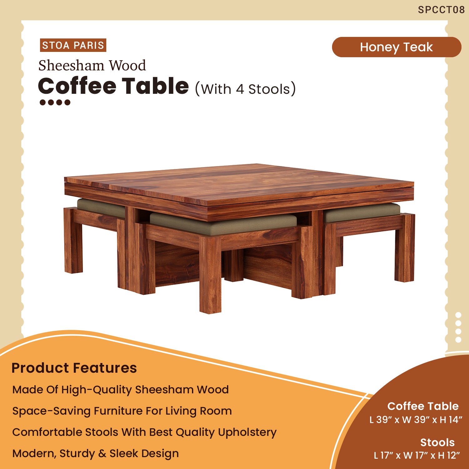 Ava - Solid Sheesham Wood Coffee Table With 4 Stools - Honey Teak