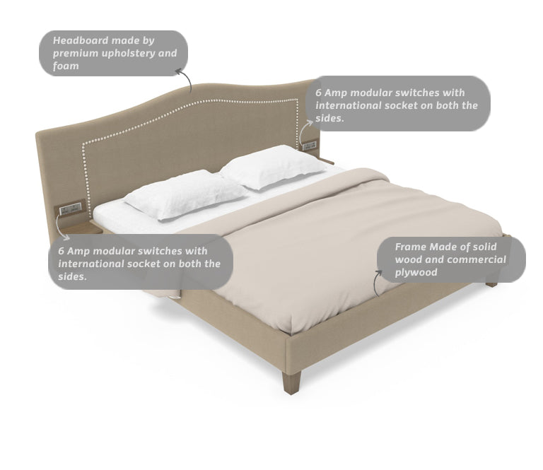 - The headboard comprises of a compact shelf beside the bed to store your essentials, along with 6 amp modular switches which ensures convenience of charging
