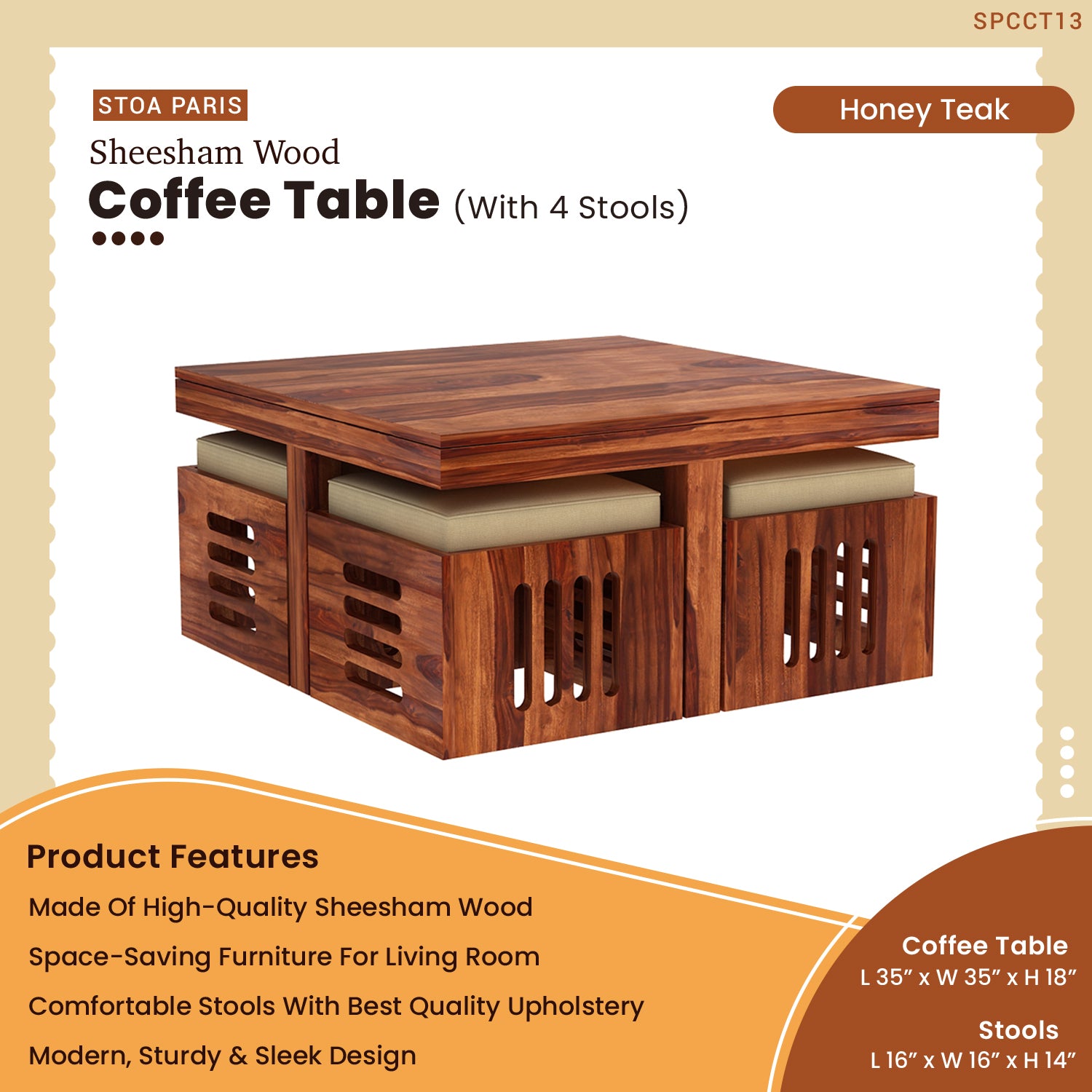 Carlos - Solid Sheesham Wood Coffee Table With 4 Stools - Honey Teak