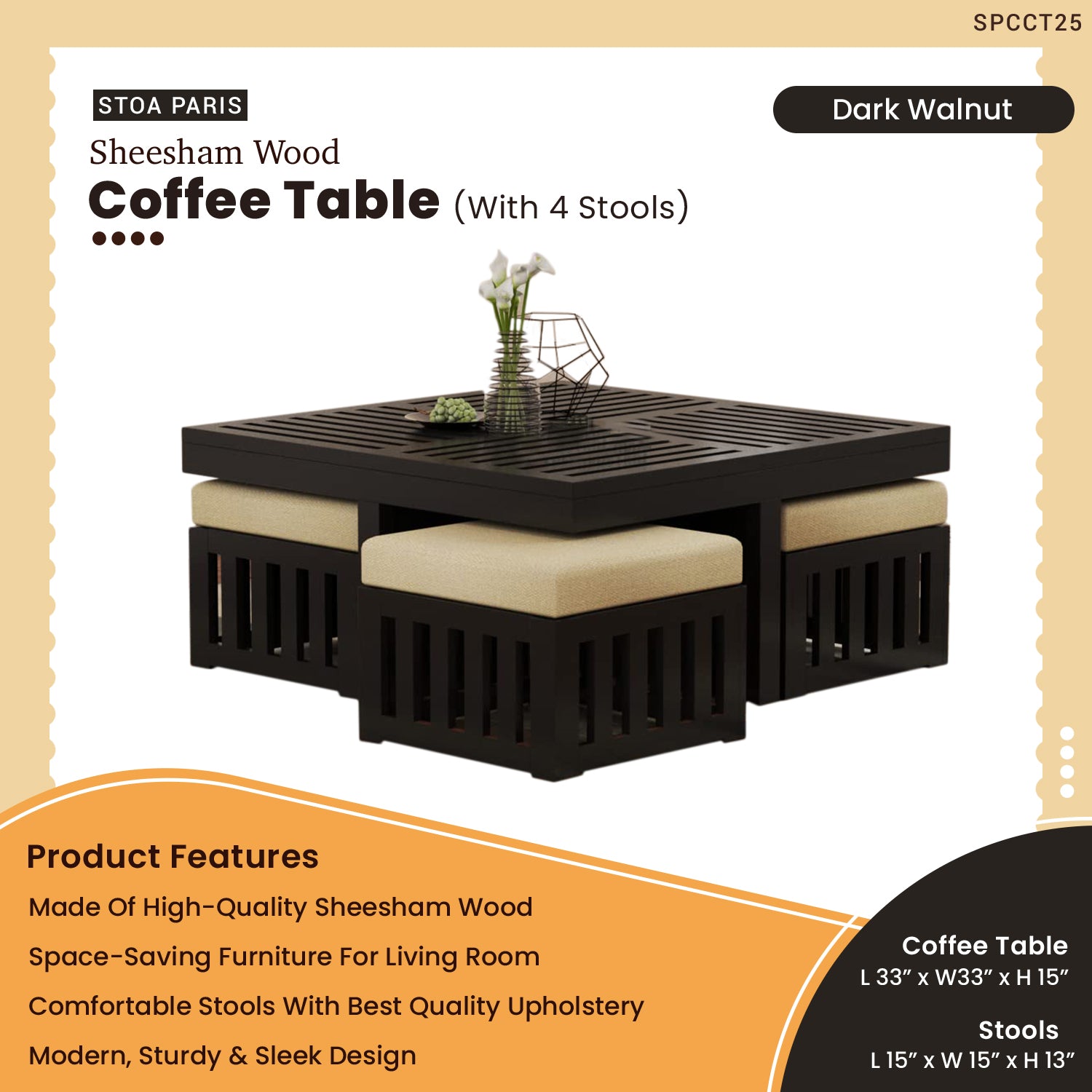- Dimensions : Coffee Table : L33" x W33" x H15"