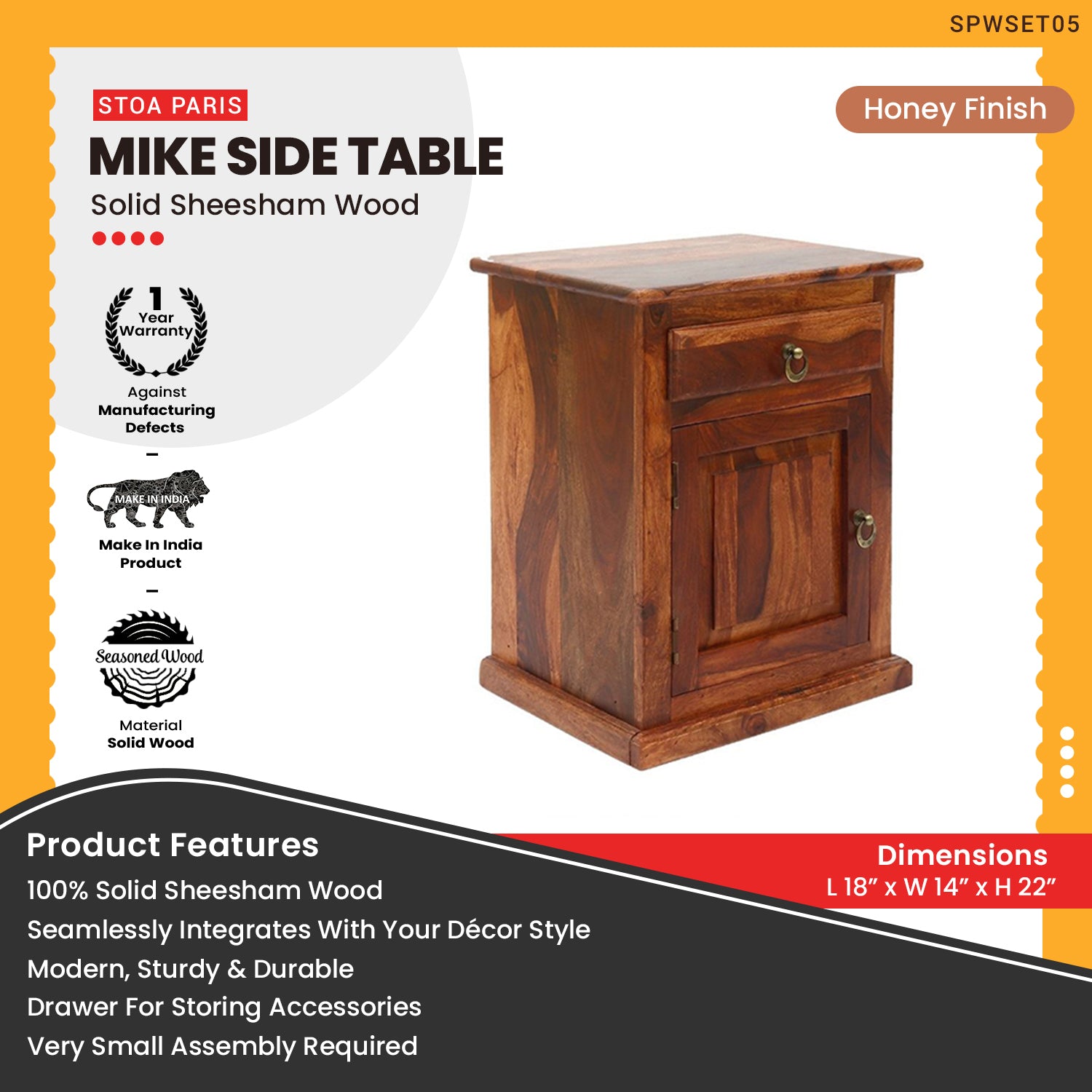 Mike - Solid Sheesham Wood Side Table With Drawer & Storage - Teak Finish