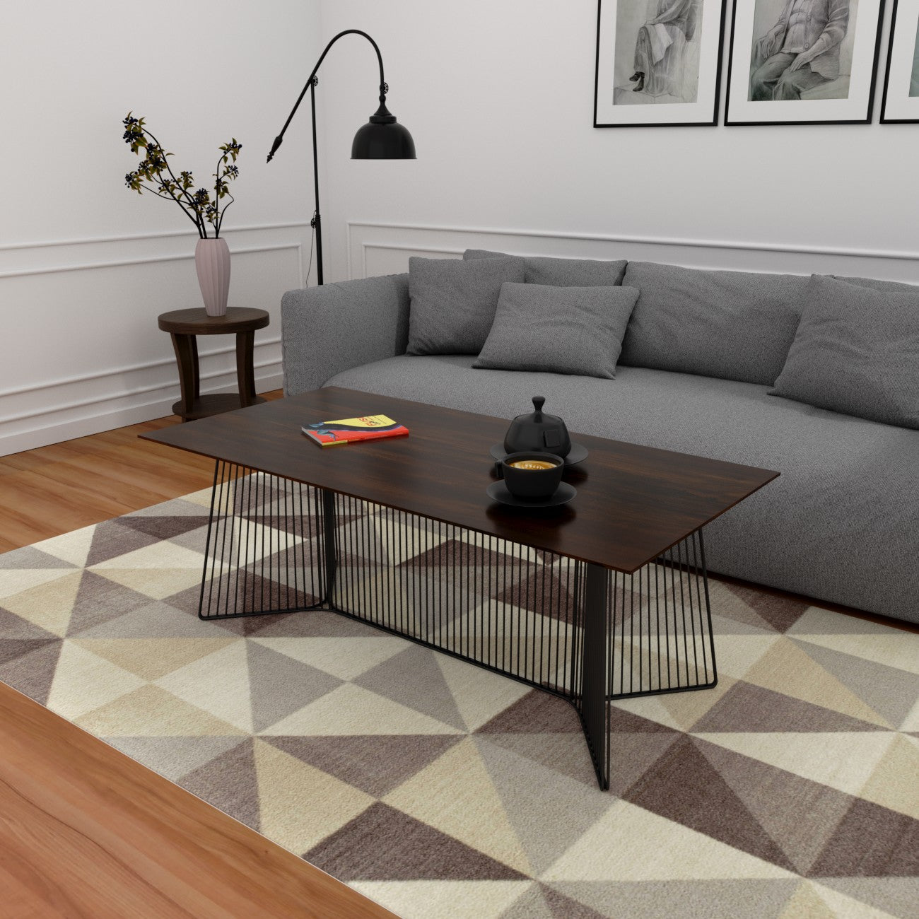 Miler - Striped Metal Base Coffee Table With Solid Wood Table Top - Dark Teak