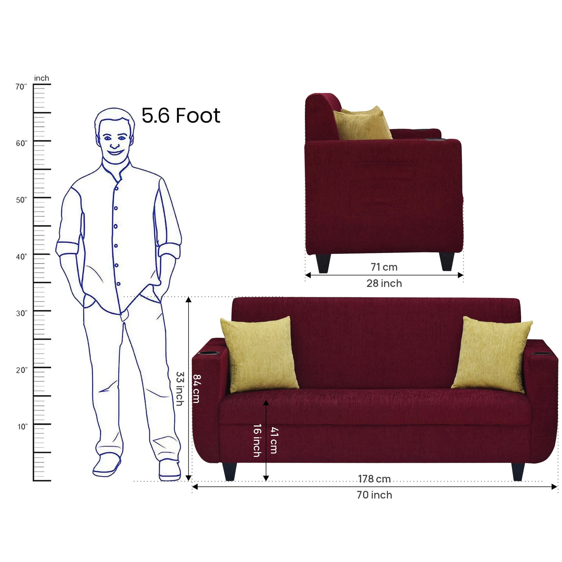 3 Seater : 70L x 28W x 33H (cms)
