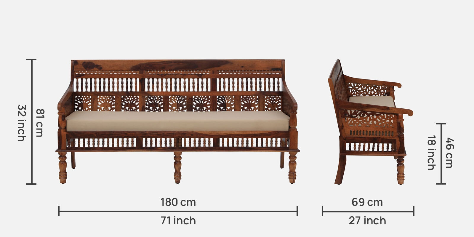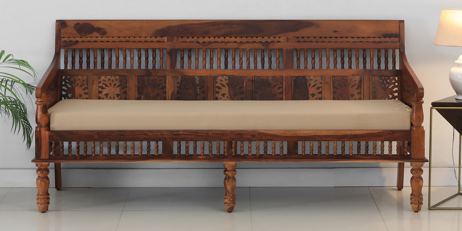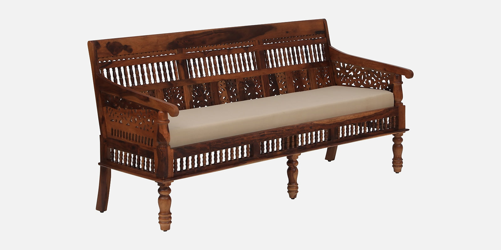 Nipe - Sheesham Wood 3 Seater Sofa In Honey Oak Finish - Beige Seat Fabric