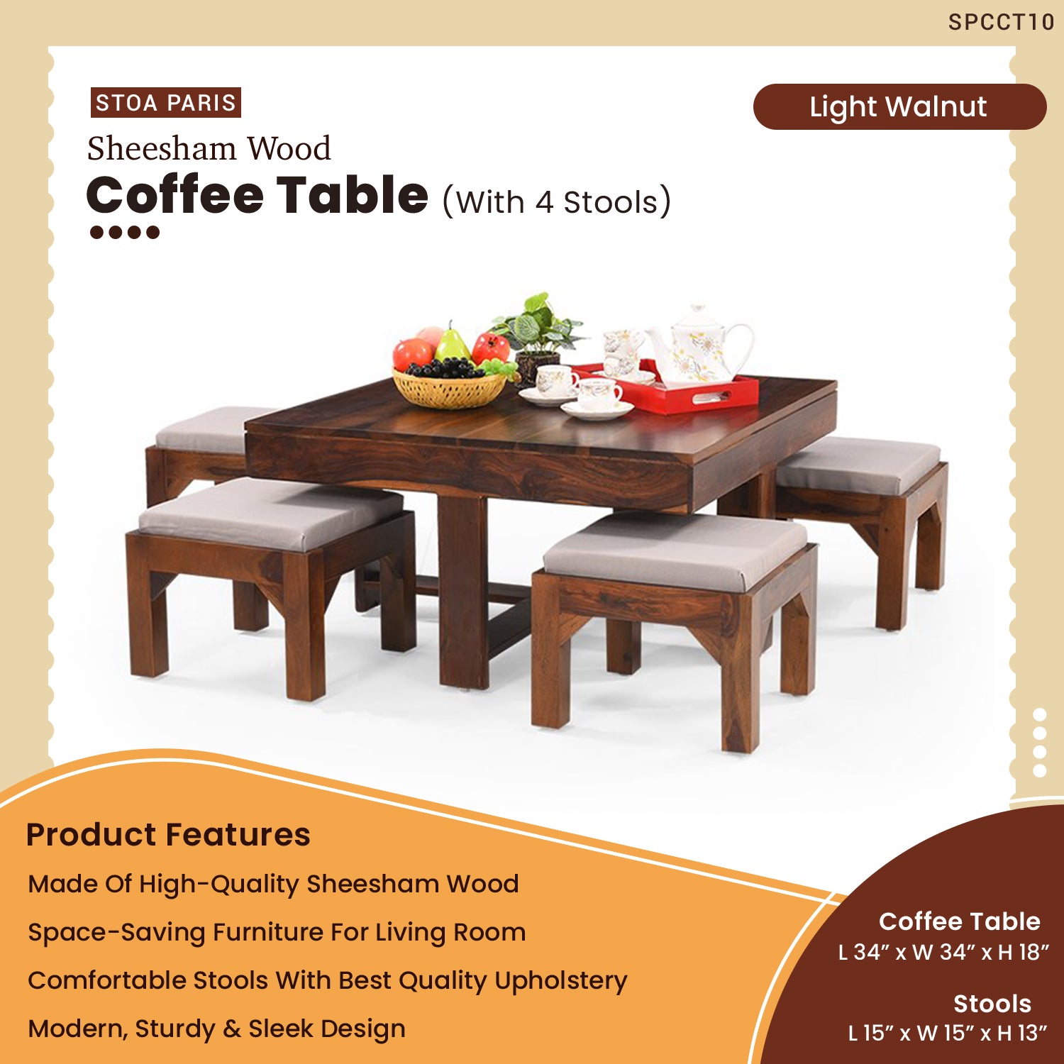 Opake - Solid Sheesham Wood Coffee Table With 4 Stools - Light Walnut