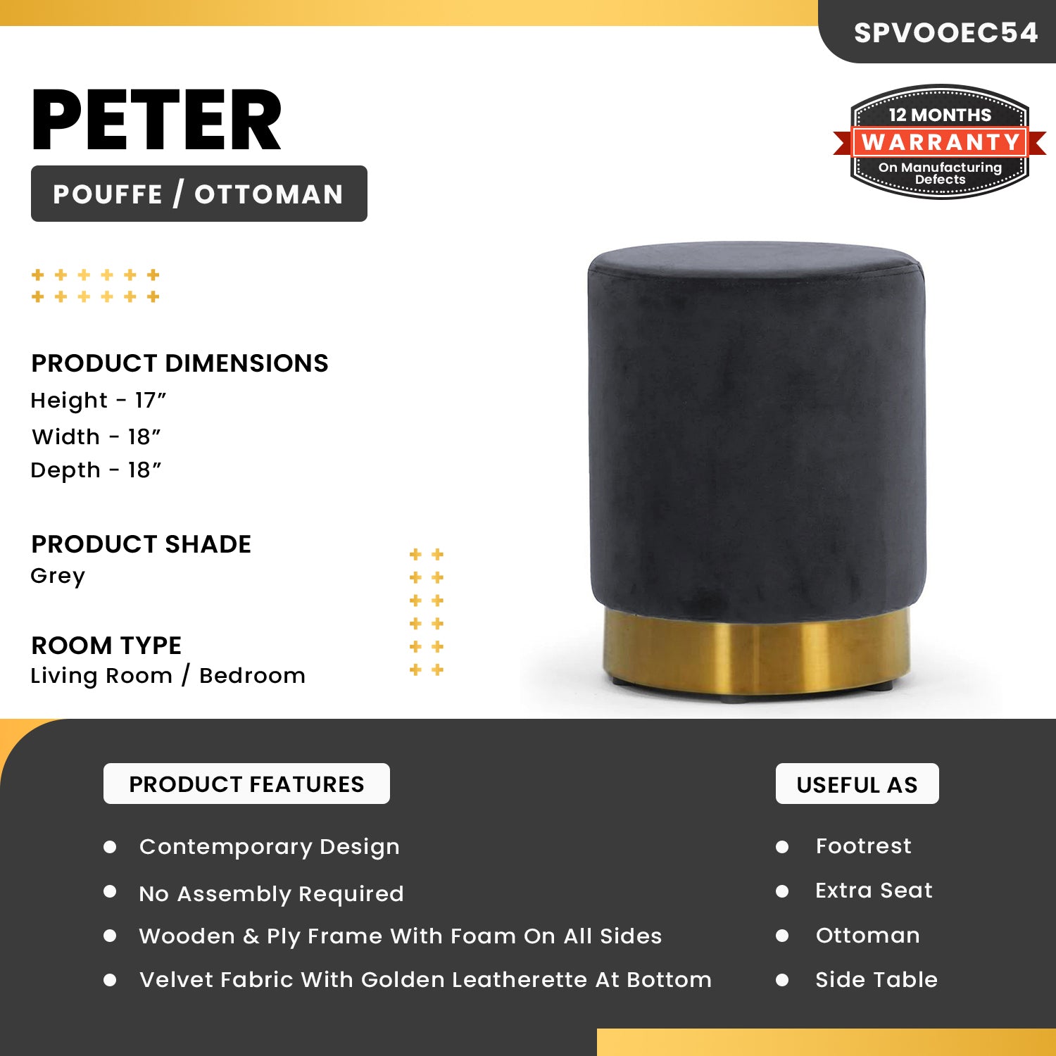 - Package contain : 1 pcs Peter Round Pouffe/Ottoman in Dark Grey Colour