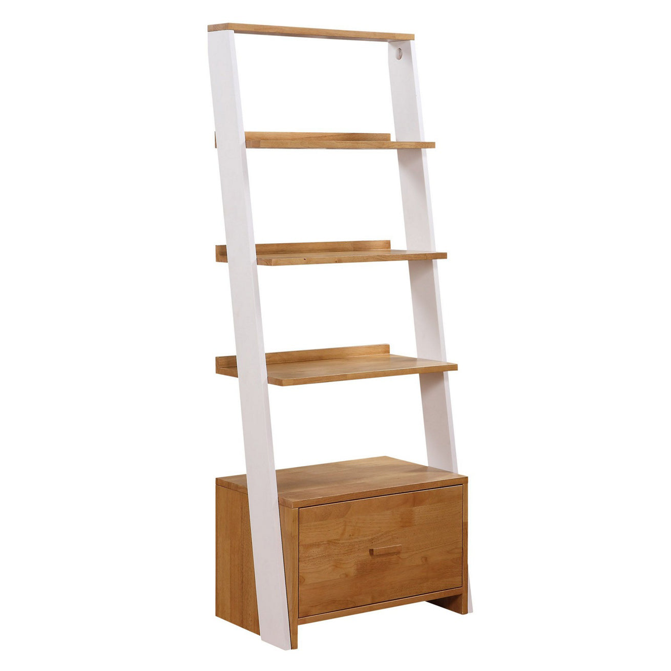 - This two-tone storage unit includes three shelves and a base with additional storage space