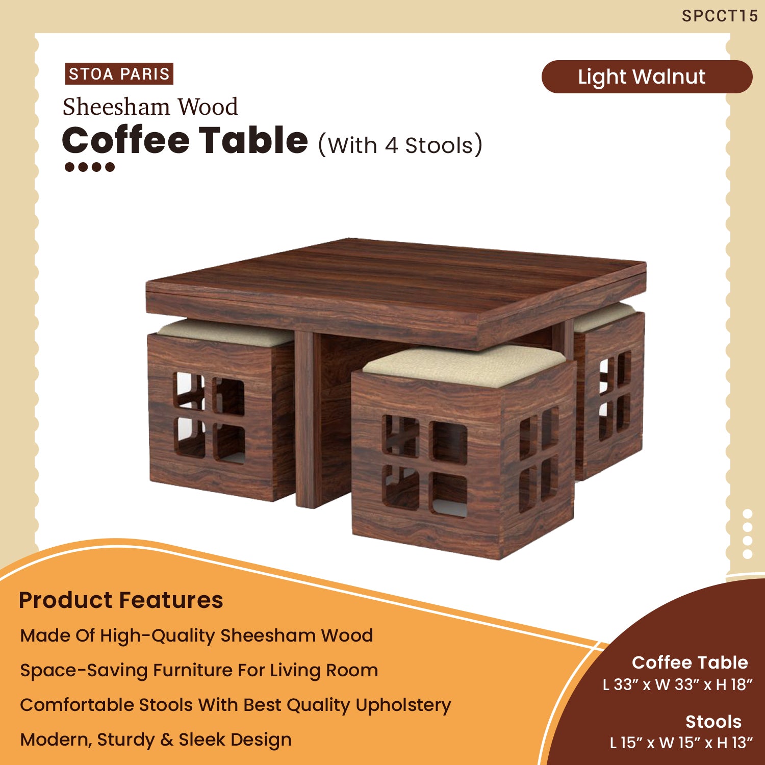 Poppy - Solid Sheesham Wood Coffee Table With 4 Stools - Light Walnut