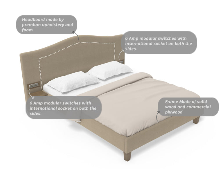 - The bed contains a 8" comfortable mattress, headboard comprises of a compact shelf beside the bed to store your essentials, along with 6 amp modular switches which ensures convenience of charging