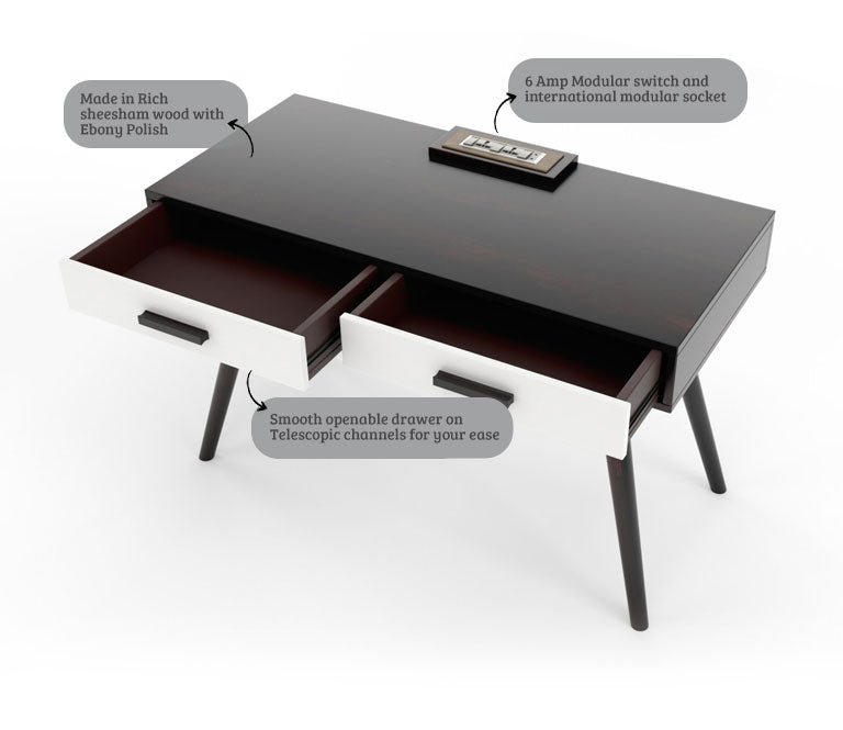 - The desk is made of high grade sheesham wood and the drawer has a lacquered finish 6 Amp modular switch and international modular socket use of night lamp and ease of charging mobile, laptops
