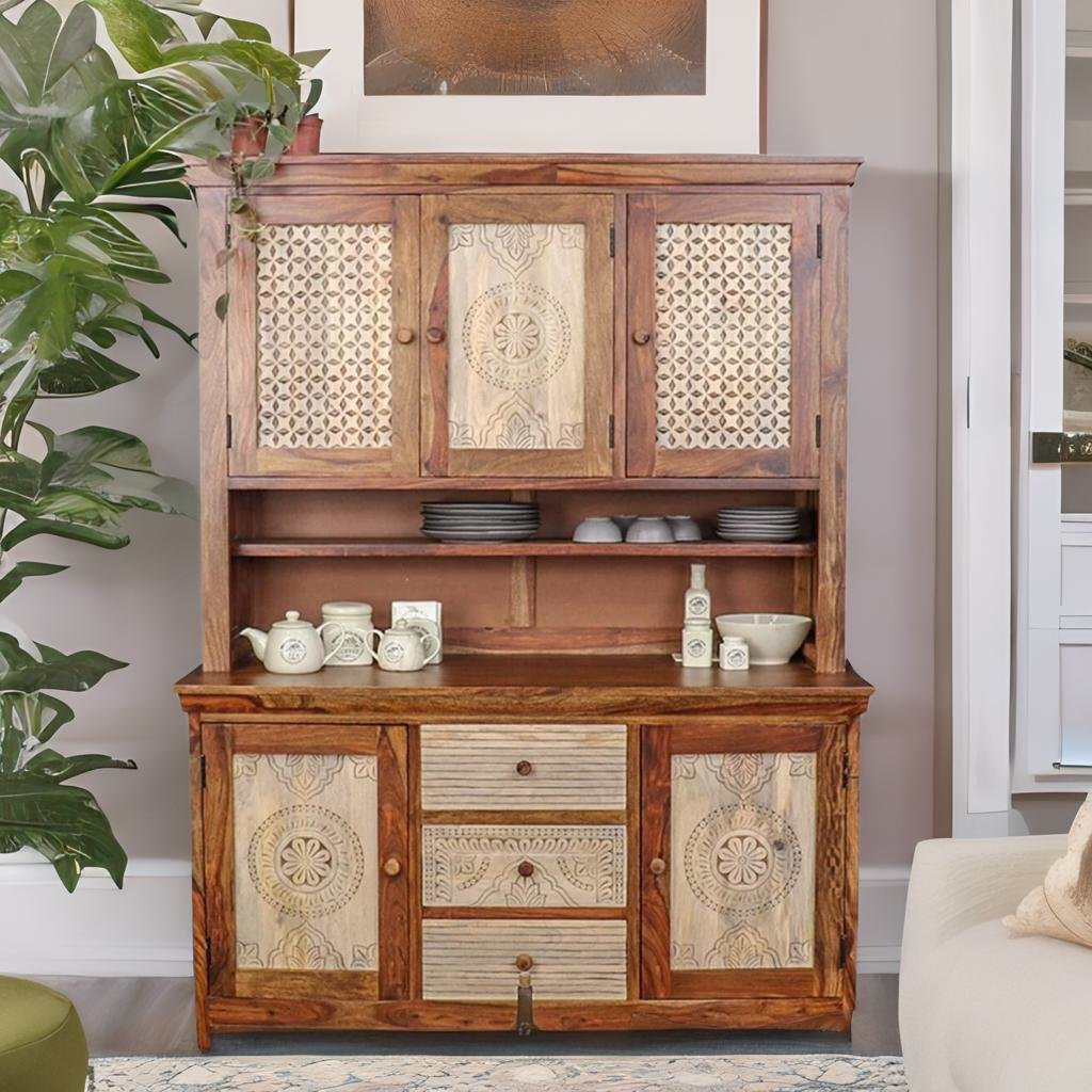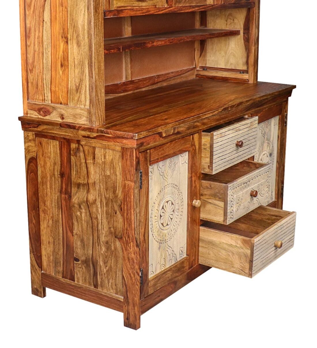 - A solid wood crockery unit, also known as a hutch, is designed to display and store dining ware, glassware, and other kitchen or dining essentials.