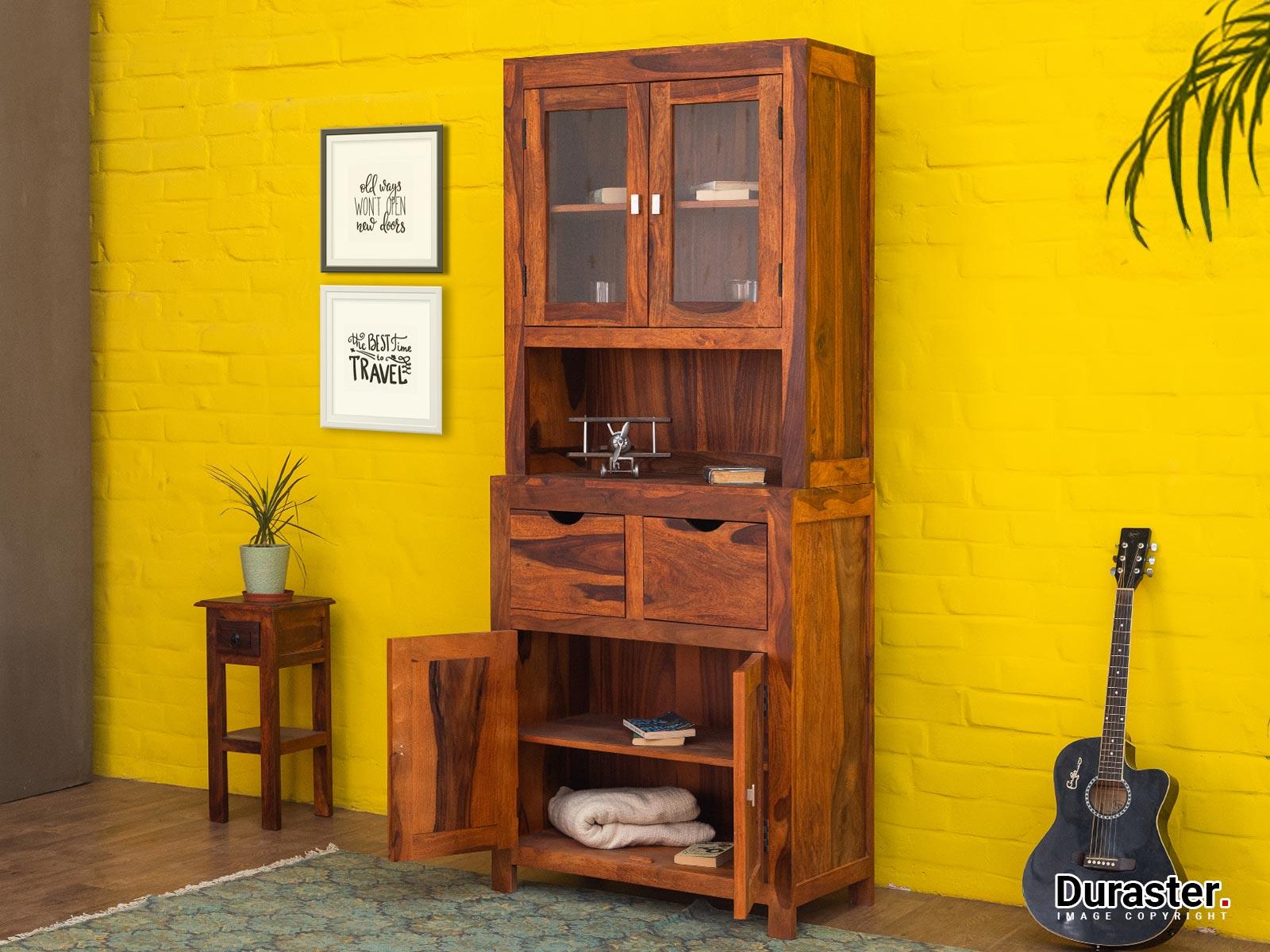 - A solid wood crockery unit, also known as a hutch, is designed to display and store dining ware, glassware, and other kitchen or dining essentials.