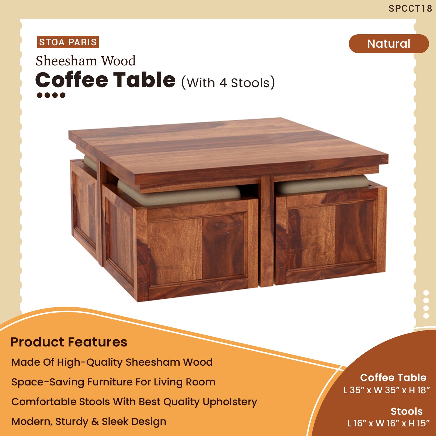 Stelar - Solid Sheesham Wood Coffee Table With 4 Stools - Natural Polish