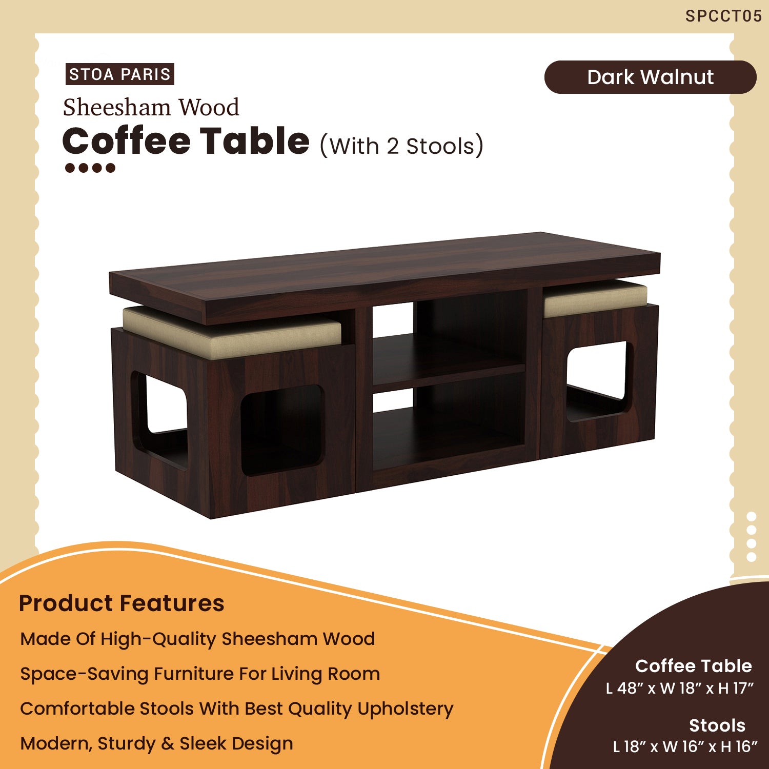 Vivian - Solid Sheesham Wood Coffee Table With 2 Stools - Dark Walnut